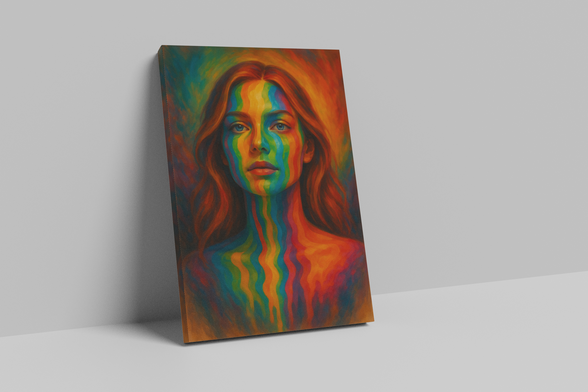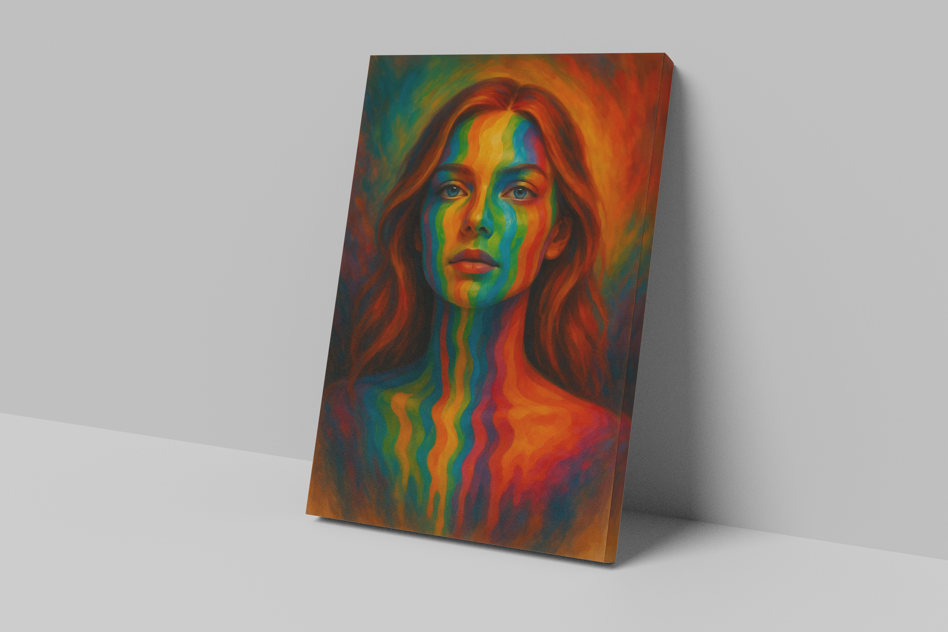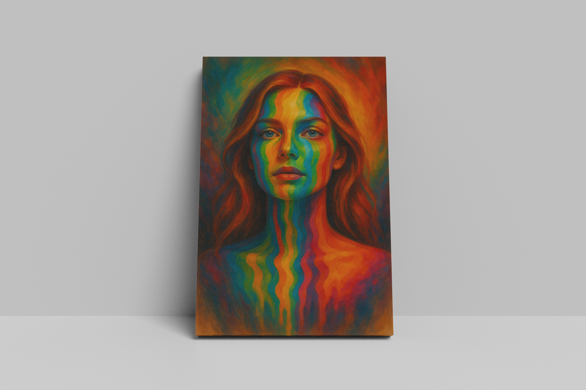 Cromatica intensă, bazată pe roșu, portocaliu, verde, albastru și violet, simbolizează unitatea dintre emoție și lumină, transformând tabloul într-un manifest vizual al vitalității și unicității umane. Perfect pentru spații moderne, el devine rapid punctul central al oricărui decor.