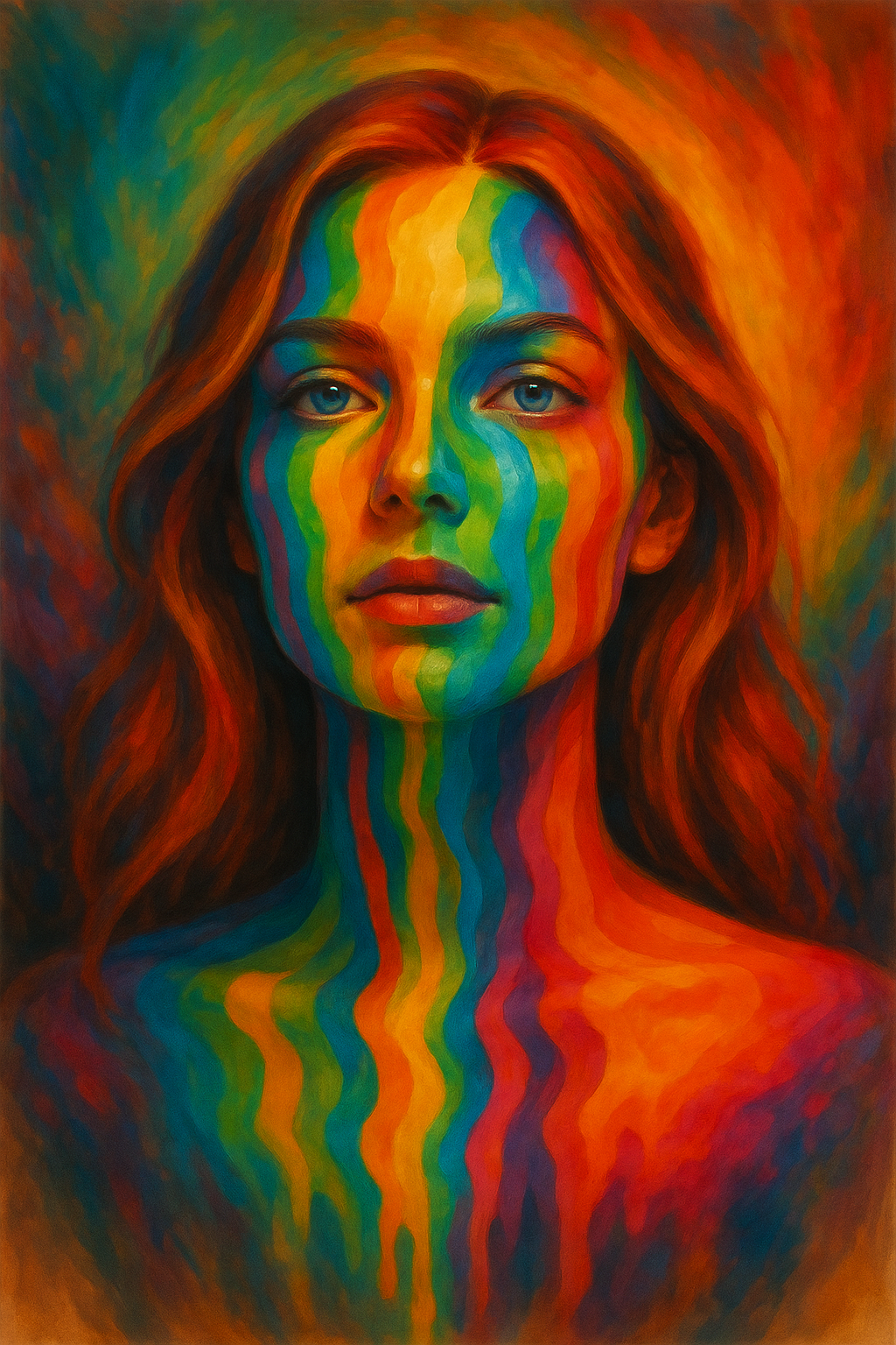 Chip în Culori este o lucrare de artă abstractă și decorativă ce celebrează diversitatea, libertatea și frumusețea expresiei individuale. Portretul feminin este redat într-o explozie de culori curcubeu, ce curg fluid pe chip și corp, creând o atmosferă hipnotică și plină de energie.