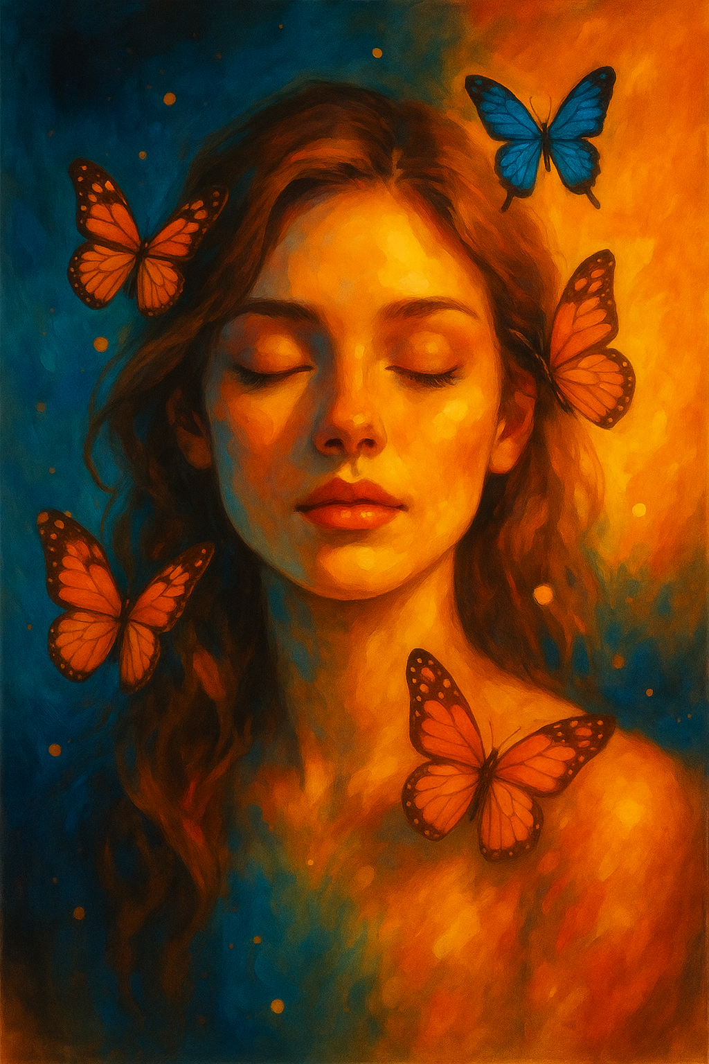 Vis în Culori este un tablou modern plin de armonie și sensibilitate, care surprinde frumusețea unei tinere cu ochii închiși, înconjurată de fluturi luminoși. Îmbinarea nuanțelor de albastru profund și portocaliu intens creează un echilibru perfect între liniște și energie, transformă această lucrare într-o metaforă a libertății și a visării.