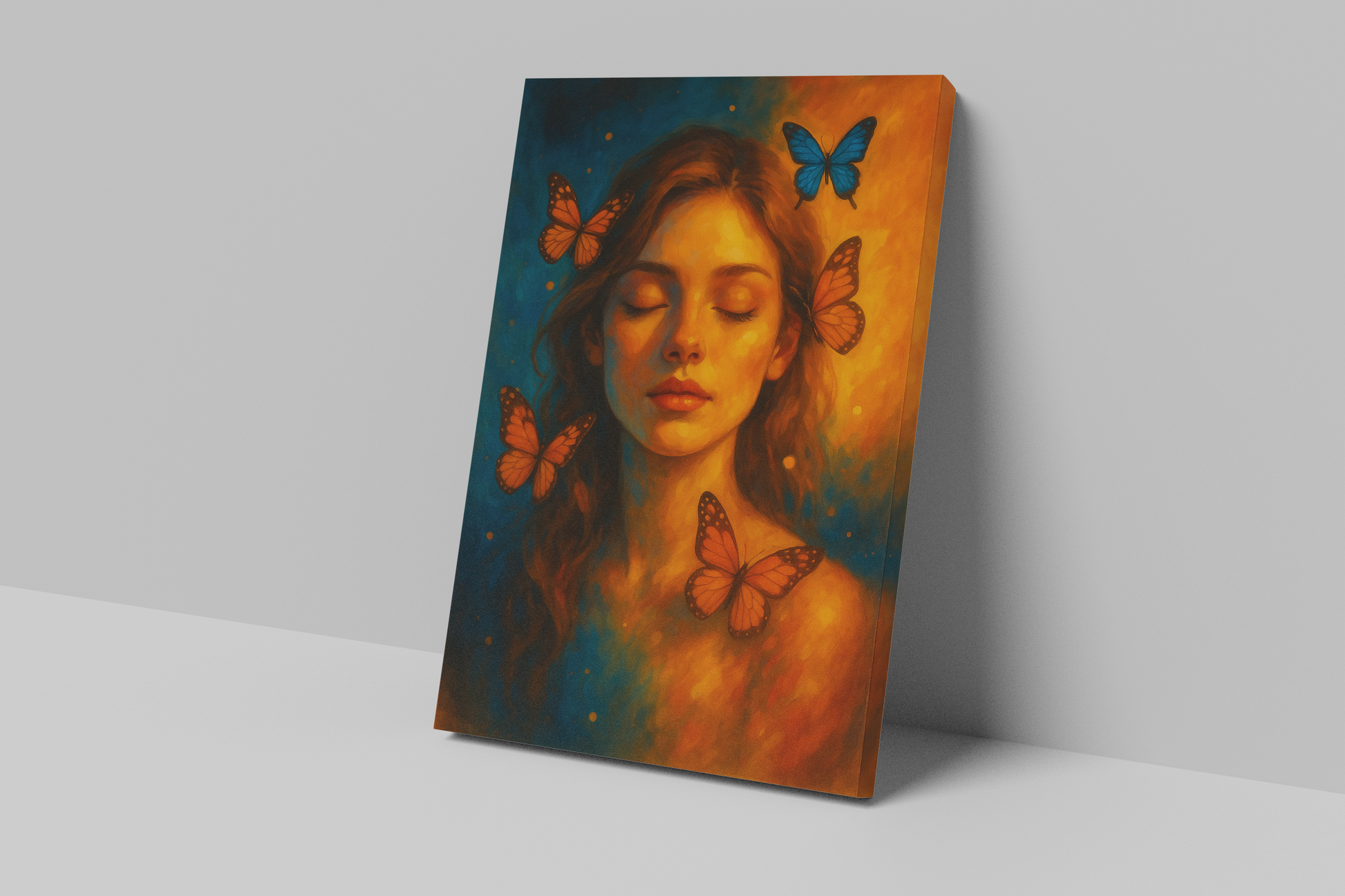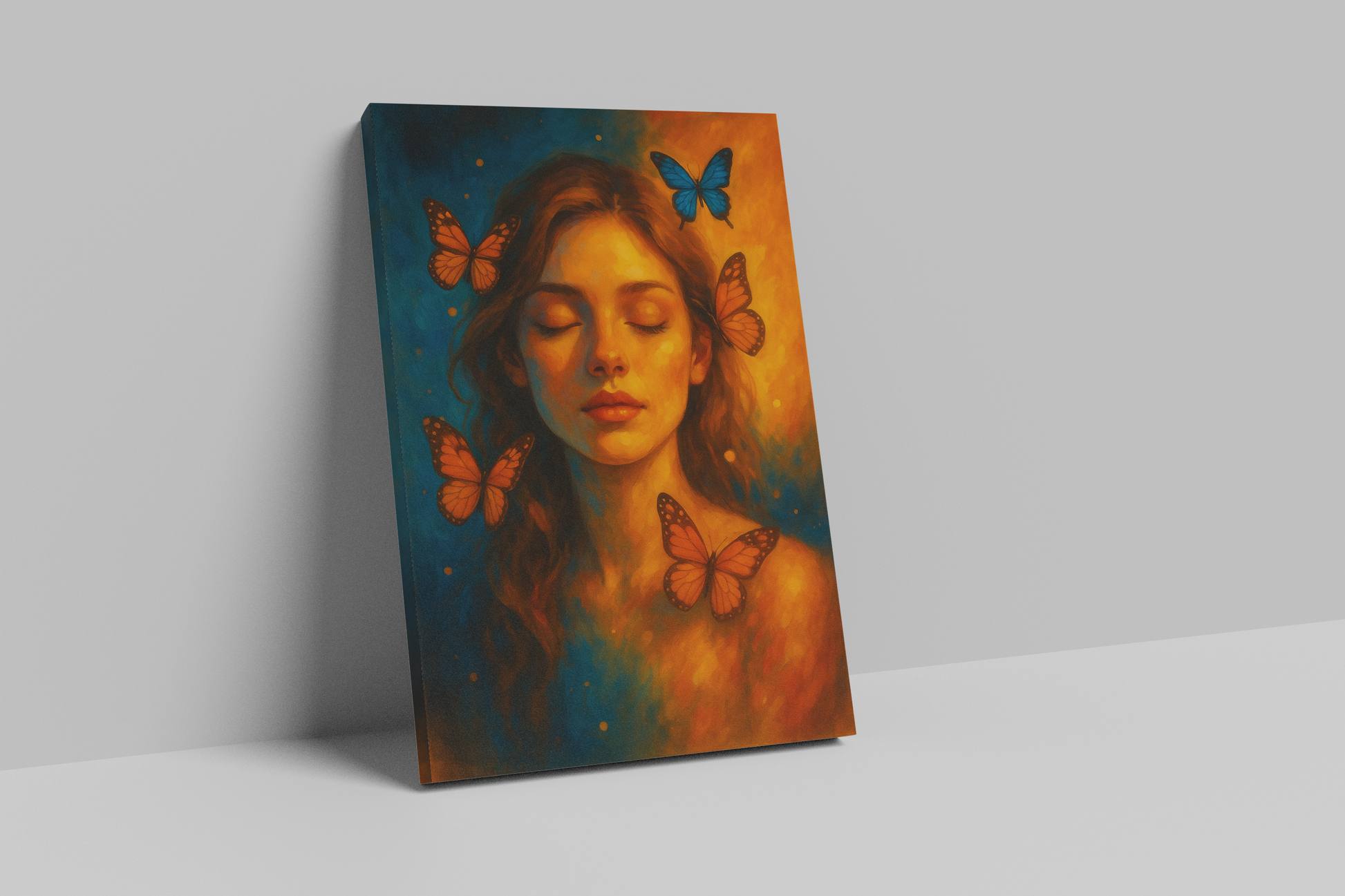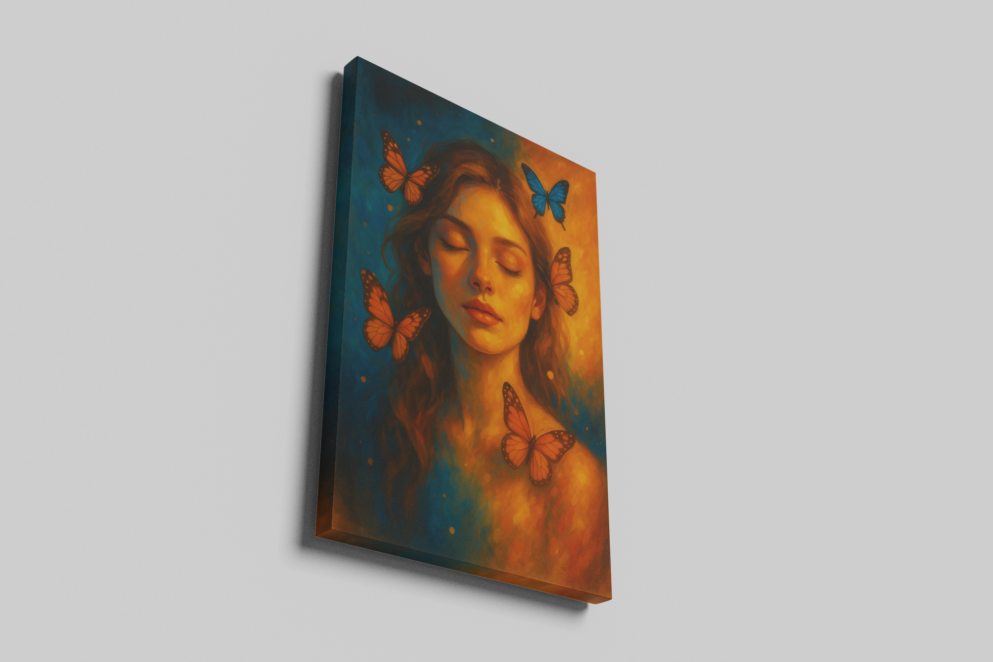 Fluturii simbolizează transformarea și speranța, iar expresia calmă a chipului transmite o stare de pace interioară. Este o piesă de artă ideală pentru cei care caută să adauge emoție și frumusețe poetică în decorul lor.